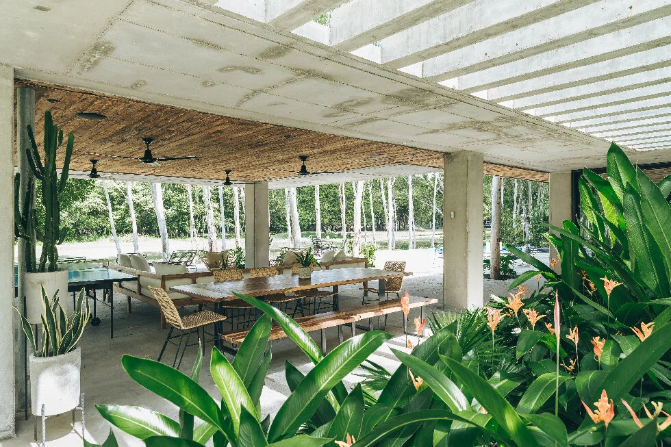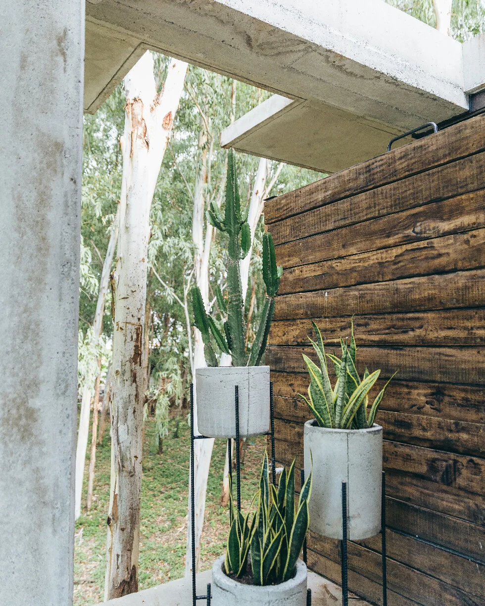 All the furniture pieces in the rooms were designed and built using locally sourced and naturally dried laurel, the most common hardwood in Nicaragua and combined with leftovers of the construction site such as the steel rebars and framings. The wood claddings and drop ceilings are built with show sugih ban fire-treated pine. Custom-made colonial tiles add depth to the large bathroom that is fitted out with bald concrete vanities and vintage accessories.